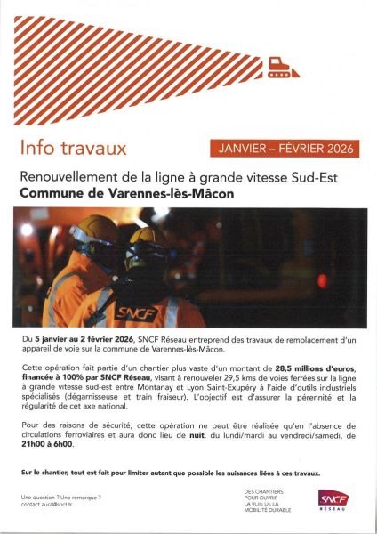 SNCF Réseau réalisera des travaux de renouvellement de la ligne à grande vitesse Sud-Est sur la commune du 5 janvier au 2 février 2026.