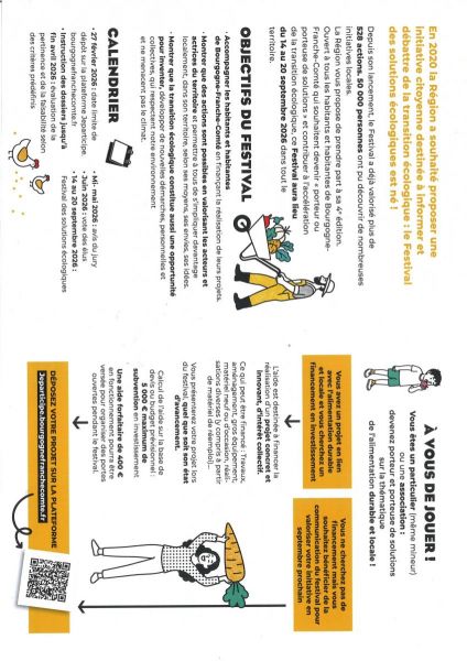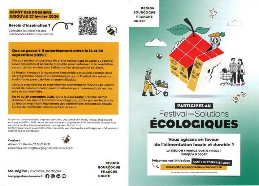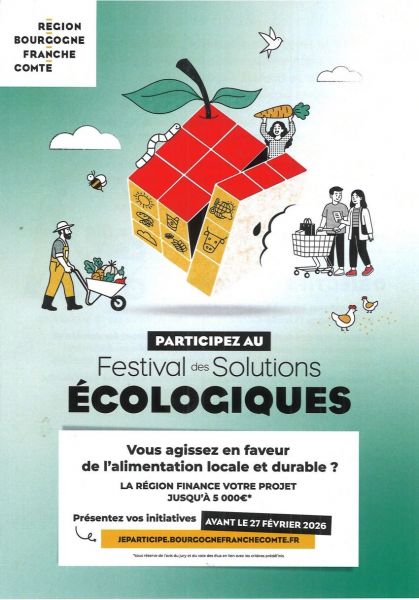 Vous agissez en faveur de l’alimentation locale et durable en Bourgogne–Franche-Comté ? La Région vous invite à devenir porteur ou porteuse de solutions et à participer à la 4ᵉ édition du Festival des Solutions Écologiques, qui se déroulera du 14 au 20 septembre 2026 sur l’ensemble du territoire.